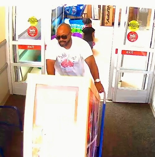 The suspect is described as a black male, medium build, with facial hair. He was last seen wearing sunglasses and a white t-shirt. His accomplice is described as a black woman with long hair, medium build. She was last seen wearing sunglasses, a multicolored shirt and pants, a black jacket, black sandals, and carrying a brown purse.